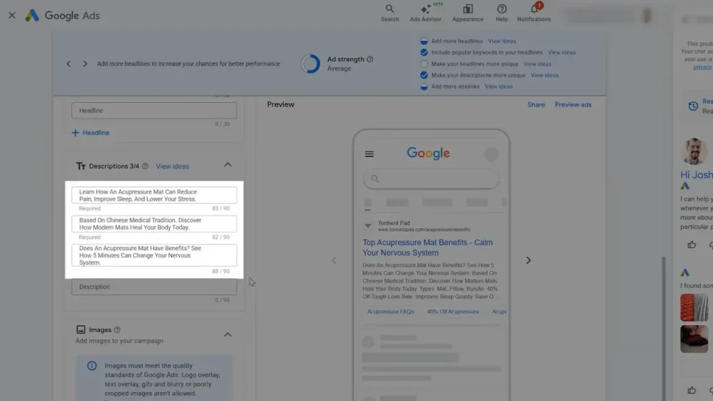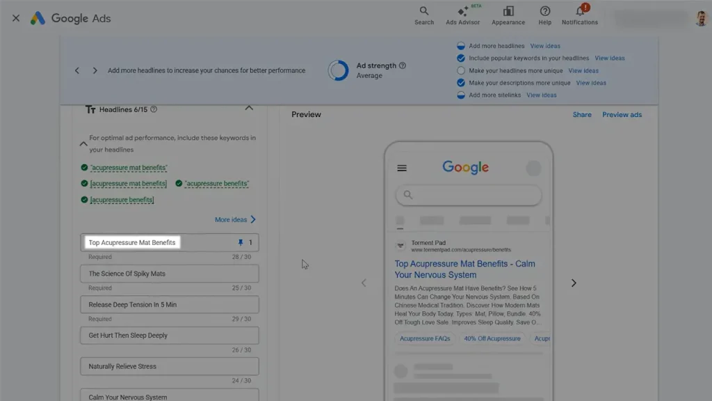 Your ad copy should match intent, not sell aggressively. The headline should closely mirror the search term. If the keyword is “acupressure mat benefits,” your headline should match. For example, “Top Acupressure Mat Benefits.”