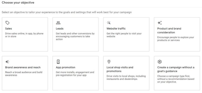 When creating a new campaign, Google encourages you to select a campaign objective. Although the Performance Max campaign option is available for some objectives, get started by selecting “Creating a campaign without a goal’s guidance”. This doesn’t affect performance but gives you the freedom to access all settings for the best setup.