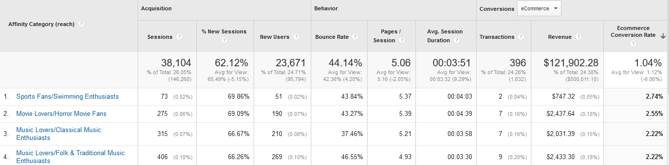 Beginners can start in Google Analytics with everything under the “Audience” section to see what gets revenue and who is most likely to buy. Affinity categories under “Interests” may help if you’re a broad-serving store. Throughout this ecommerce conversion rate guide you will learn how to maximize your CRO from your analytics.